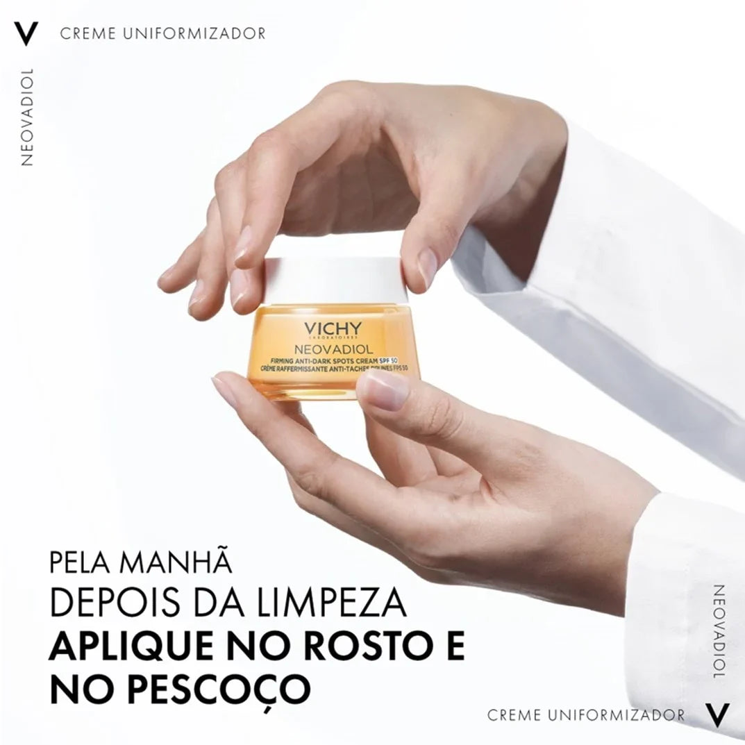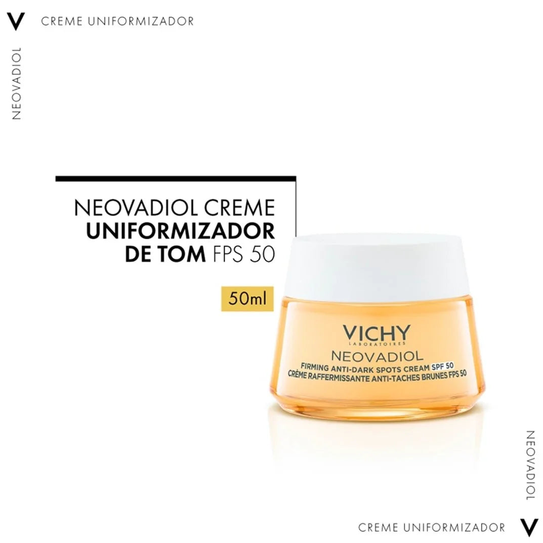 - O Neovadiol Creme Uniformizador de Tom FPS50 reduz os impactos da pele na menopausa aumentando a elasticidade, firmeza, nutrição e redução de rugas. Com uma textura creme leve, possui rápida absorção e leve fragrância. Sua fórmula leve é enriquecida por Proxylane, Extrato de Cássia de origem vegetal, Niacinamida (Vitamina B3) e Ômegas 3-6-9. Ajuda a proteger a pele dos danos causados pelos raios UVA e UVB, auxilia na compensação dos impactos da menopausa e da exposição solar para uma pele mais iluminada e uniforme.
